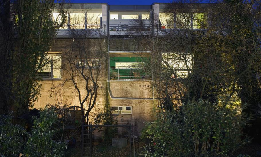 Dem Bunker F38 in der Claussenstraße in Bremen setzten wir ein Penthouse auf das Dach. Die oberen Bunkergeschosse verwandelten wir in zwei Wohnungen, die unteren in eine Galerie für Kunst und Musik.
